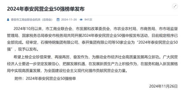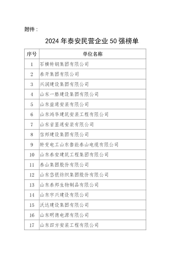 热烈祝贺集团公司再次获评泰安民营企业50强,位列第三位,泰安市建安企业第一